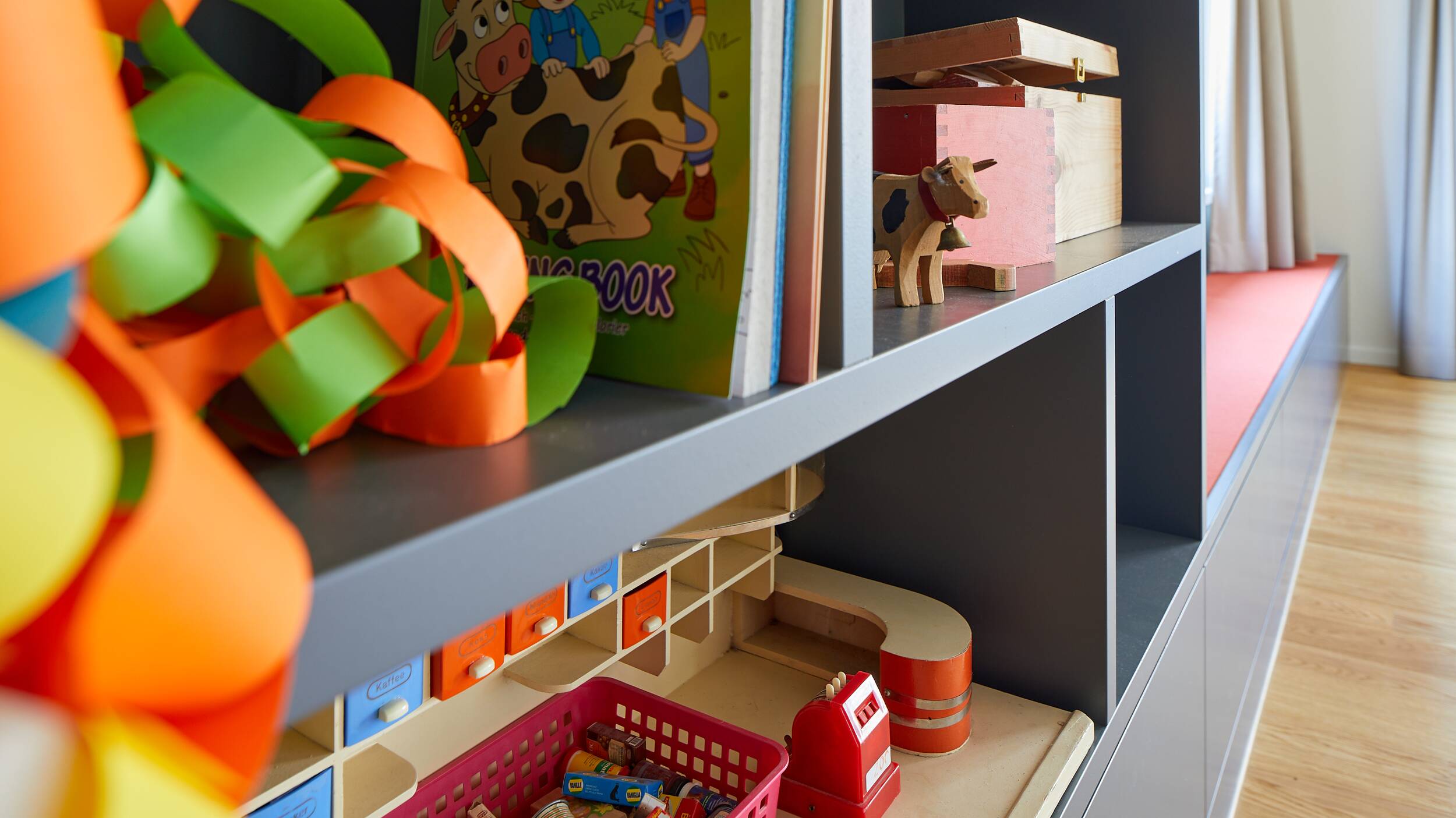 Im Regal befinden sich Bauklötze und andere Kinderspielsachen, auch zwei Kinderstühle sind vorhanden.
